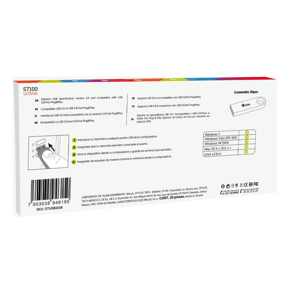 Lleva siempre contigo tu información con este pack de 20 USB de 16GB cada una. Con conexión USB 2.0 compatible con 3.0, son resistentes al agua y golpes, perfectas para uso escolar, laboral o promocional. Compatibles con todo tipo de dispositivos.